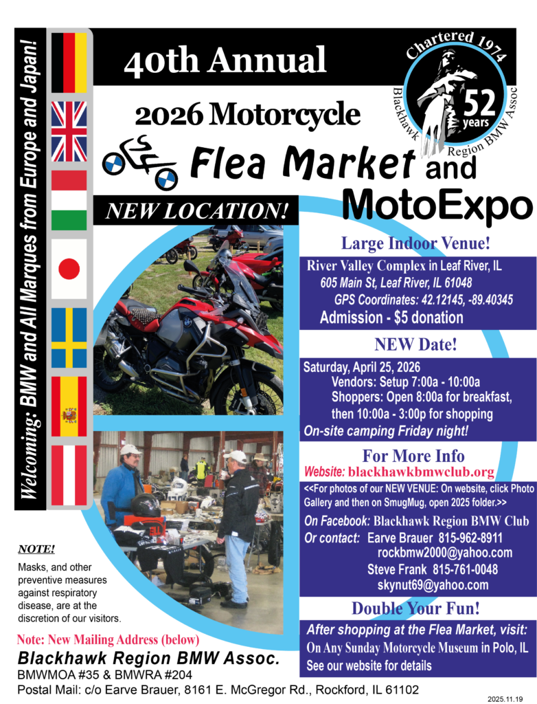 Contact Earve Brauer, 815-962-8911 (til 8:00 p.m) or rockbmw2000@yahoo.com, or Steve Frank, 815-761-0048 or skynut69@yahoo.com.