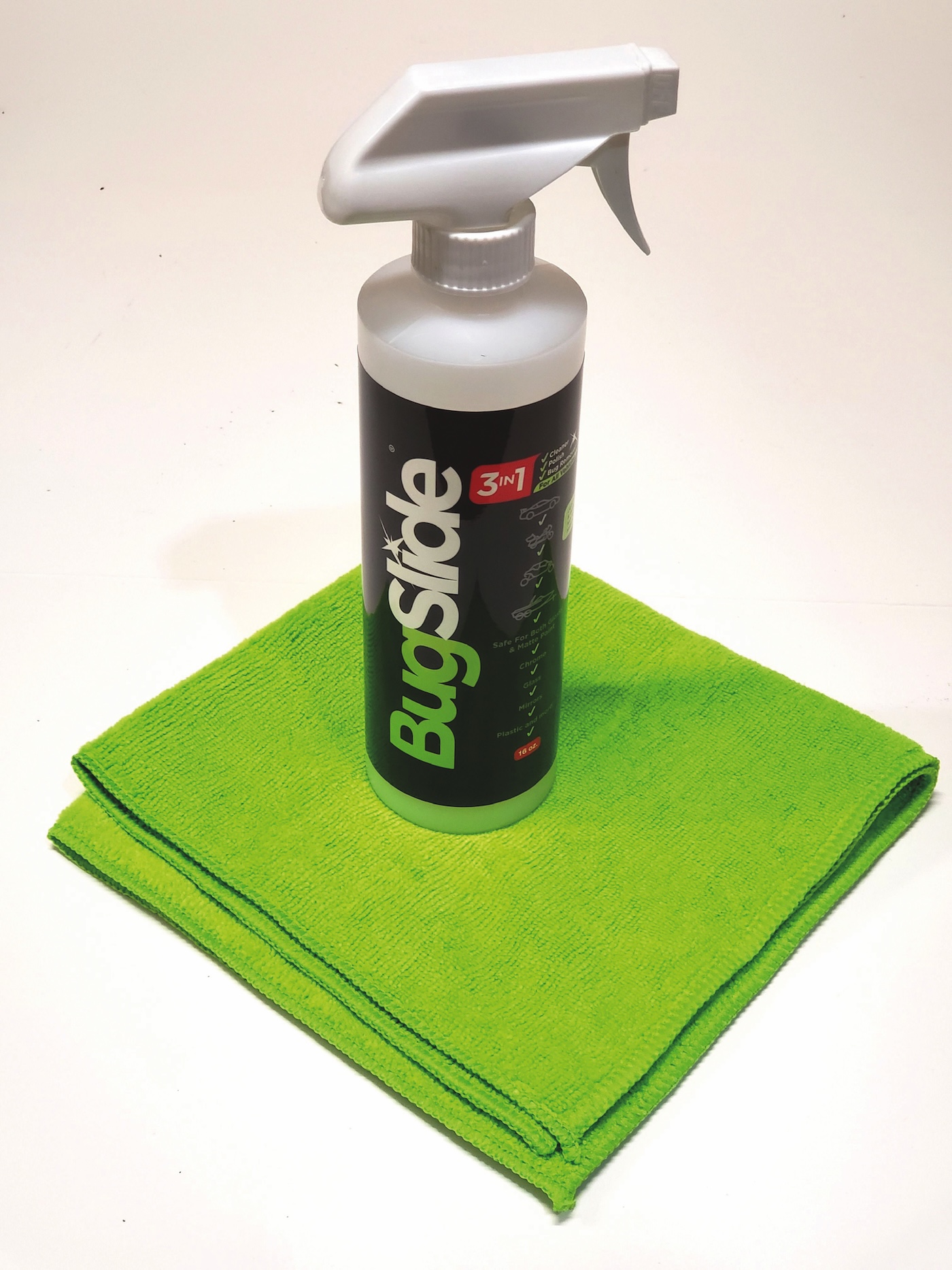 As for value, BugSlide is on the expensive side of this product category. The 16-ounce spray bottle and 16” x 16” microfiber towel package I bought is available online for $22 plus shipping, or $29 with free shipping, depending on the vendor. Many additional options are offered, with bottle sizes ranging from 4 oz. to 2.5 gal., with and without microfiber towels. For comparison, a 16 oz. spray bottle of ProtectAll costs $15.39 on Amazon (which may or may not include shipping, depending on the size of your order and your Prime status) and you’ll have to supply your own cleaning cloth (good microfiber towels like the one from BugSlide are readily available for less than two bucks apiece). To be fair, ProtectAll doesn’t dissolve bugs as efficiently as BugSlide and its slightly more viscous consistency requires considerably more wiping to remove after application; it will also produce a potentially unwelcome sheen on matte finishes and contains carnauba wax, as opposed to the more sophisticated polymer chemistry in BugSlide.