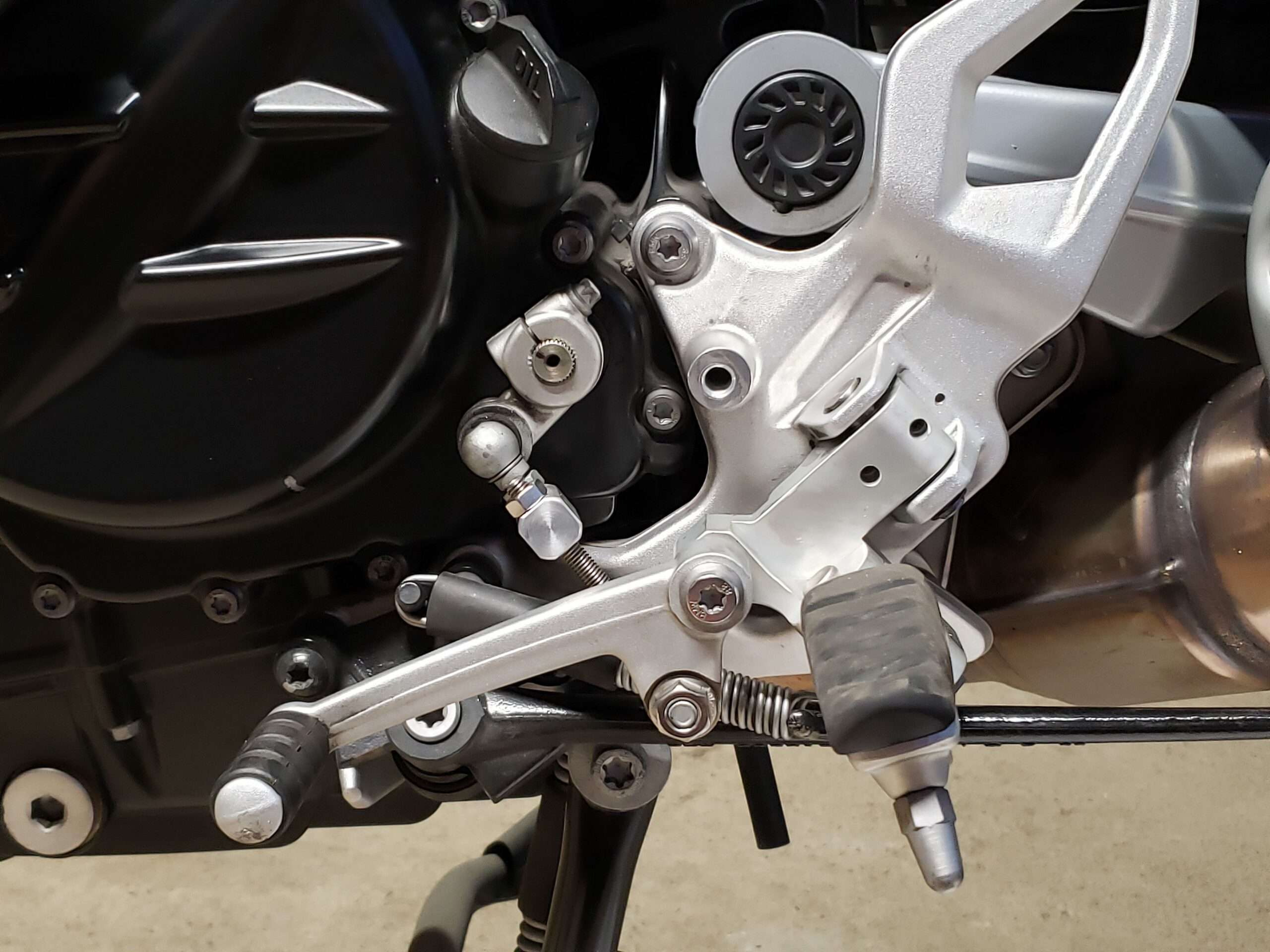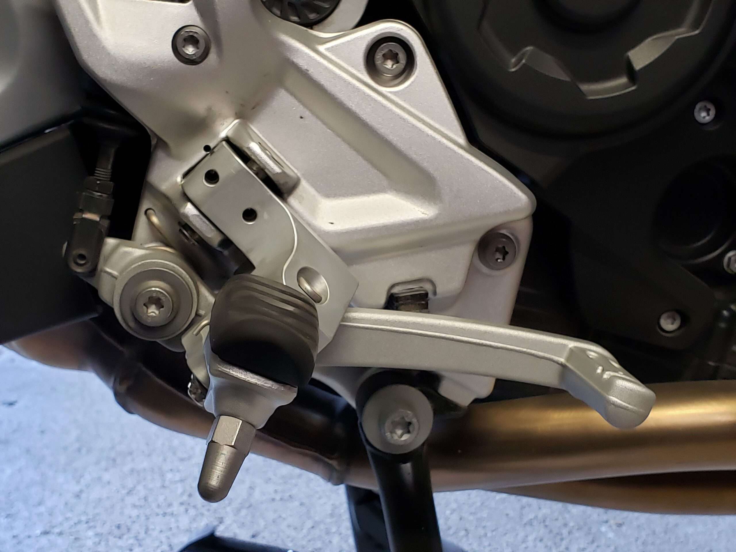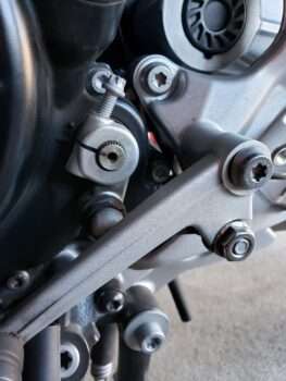 Installation instructions from SM were complete, clearly written, and included helpful illustrations. I had just one small problem: the bore for the left adapter’s retaining pin (the one securing it to the OEM bracket) was very slightly out of place, so the pin could not pass through both holes in the stock bracket. The pin slipped readily through the top bracket hole and the adapter’s bore, but then fouled the edge of the bottom bracket hole. This was easily remedied using a Dremel tool with a grinding bit to relieve the bottom hole of a small amount of material (cast aluminum) on the edge blocking the pin. It only needed 0.5mm of additional clearance, but this was an unexpected irregularity in a kit otherwise extremely well-crafted. For all I know, the problem could have been imprecise alignment of the factory bracket holes, rather than a defect in the SM adapter. After all, in the stock configuration, the foot peg was more loosely situated than the adapter and didn’t require perfectly aligned holes for its pivot pin. Installation involved two more challenges, neither of which reflected any fault in SM’s engineering or fabrication. First, adjusting the shift lever height required some trial-and-error. Because of the somewhat convoluted arrangement necessitated by the lever’s design, it must be removed for each change. Hence, you can’t make fine adjustments with the lever in place and immediately see what you’re getting. Each change must be some number of full rotations around a threaded rod with the shifter dangling off its pivot. This is not a horrible inconvenience, but it does mean getting the lever where you want may take several multi-step removals and replacements. Tip: If you don’t have an E8 Torx socket for the linkage arm pinch-bolt, a quarter-inch socket will work.