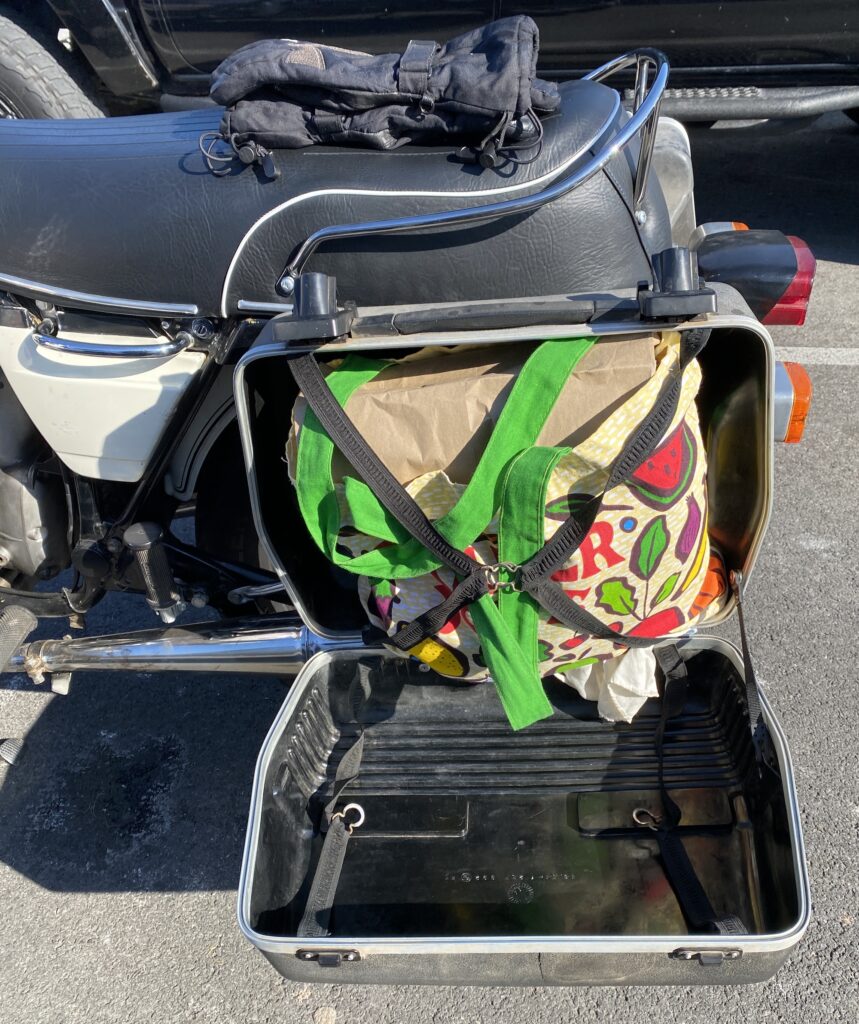 The check-out clerk clocked my jacket—I left my other gear on the bike—and seemed puzzled that anybody on a motorcycle would be on a grocery run. It’s perfectly routine to me no matter the bike. I got an extra paper bag to cushion the eggs and everything got home safely. Hoping/planning to ride the next two days as well!